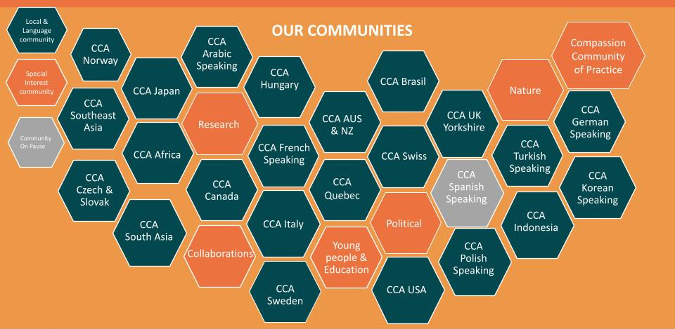 Local Communities focus on bringing people together in a geographical location or other identifiable region. Many of our local communities are national such as CCA Japan, CCA USA, CCA Canada, but others cross national border such as CCA Africa or CCA Southeast Asia. Other communities are much more regionally focused such as CCA Yorkshire, UK or CCA Quesbec, Canada.